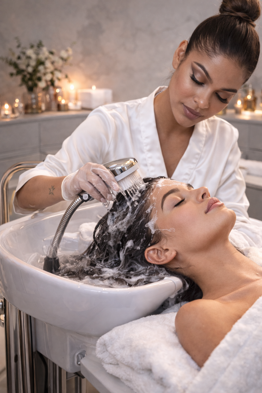 Daarna volgt een ontspannende hoofdhuid-, nek- en schoudermassage. Deze massage helpt spanning los te laten, verbetert de zuurstoftoevoer naar de haarwortels en ondersteunt een gezonde haargroei. Verzorgende serums en maskers worden afgestemd op jouw hoofdhuidtype — bijvoorbeeld bij droogheid, gevoeligheid of overmatige talgproductie.
